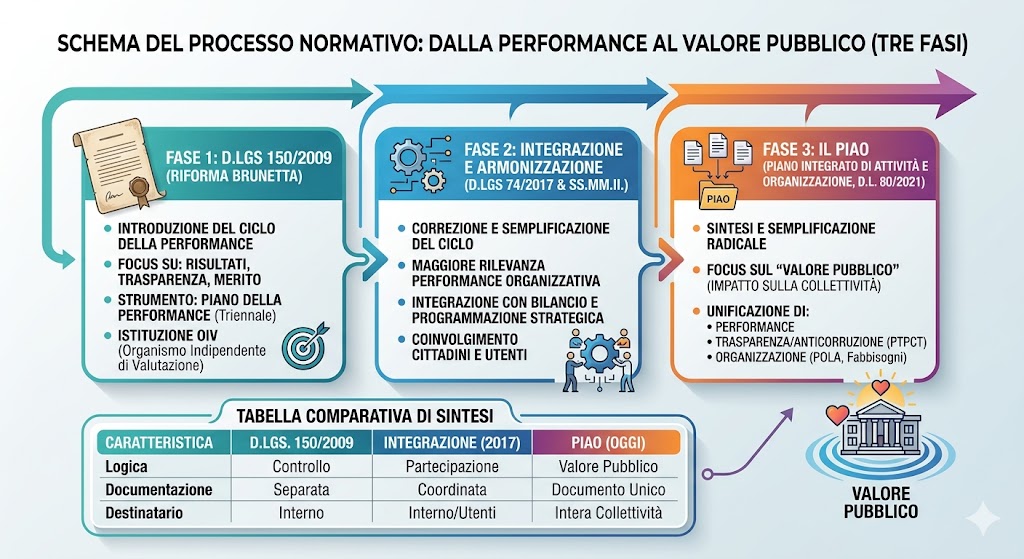 Questa infografica riassume il percorso normativo che ha messo il ciclo della performance al centro della PA, partendo dalla sua introduzione con il D.Lgs 150/2009 fino alla sua piena integrazione nel PIAO.