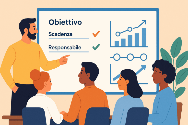 In sintesi: per dare obiettivi efficaci al team serve allineare la direzione aziendale, definire risultati misurabili, assegnare responsabilità chiare, scandire il ritmo di verifica e sostenere il percorso con feedback e riconoscimenti. In questa guida trovi un metodo in 5 passi, esempi per funzione, una checklist pronta e le risorse per partire oggi.
