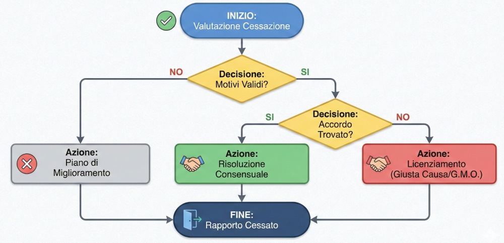 Questo schema ti aiuta a visualizzare i diversi percorsi che portano alla fine del rapporto di lavoro.