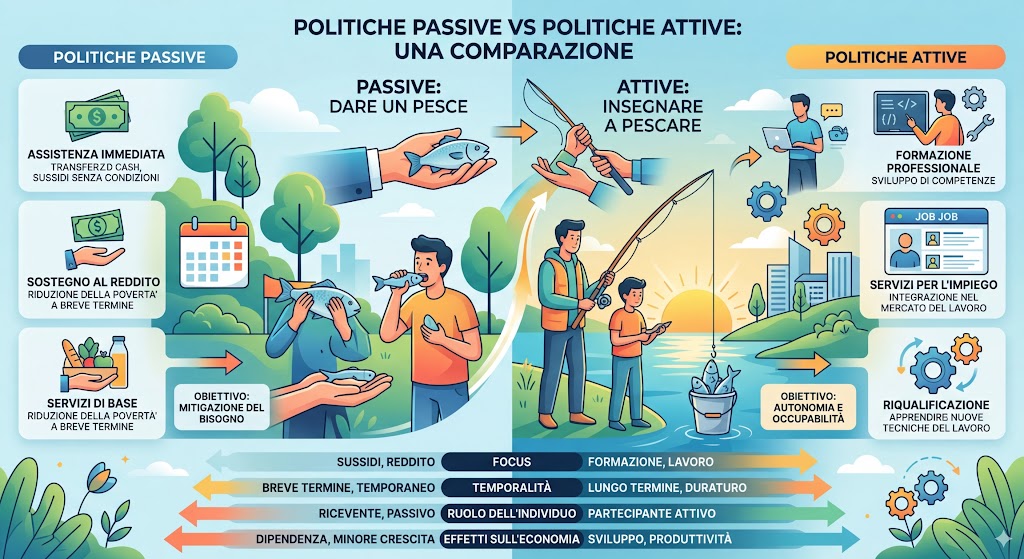 Una metafora chiarisce tutto: le politiche passive “danno un pesce”, mentre quelle attive “insegnano a pescare”.