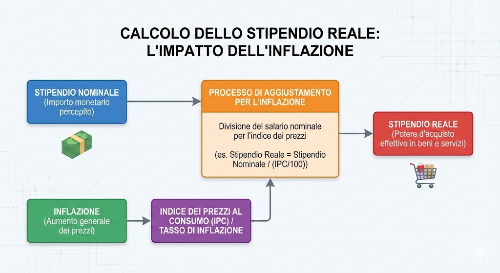 Questo schema riassume bene il percorso logico che trasforma lo stipendio nominale in potere d’acquisto reale, mettendo in evidenza il ruolo cruciale dell’inflazione.